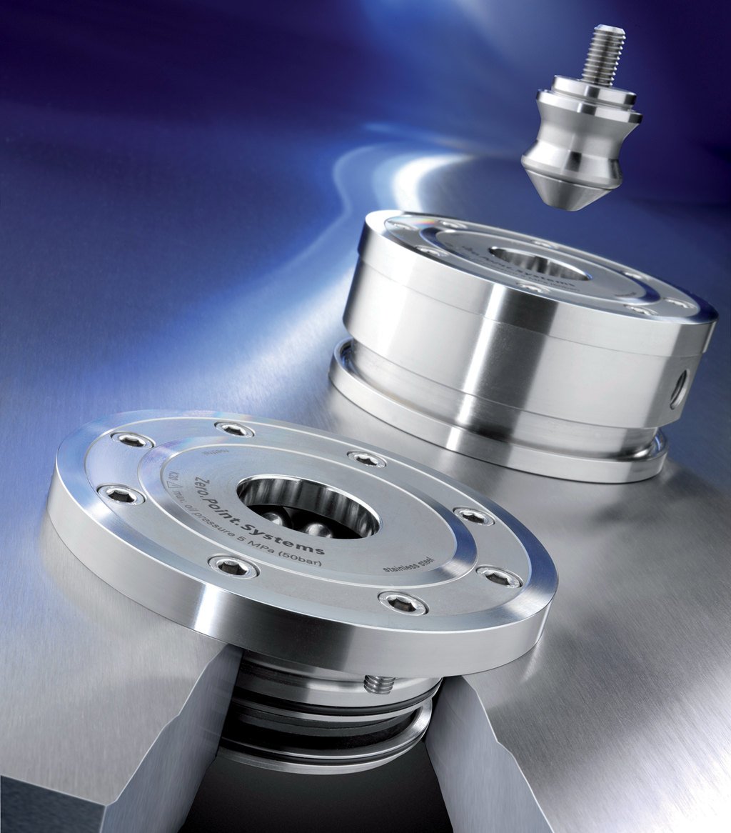 零点定位系统是由零点定位凹头和凸头组成的用于时间工装夹具快速更换的机械机构,其重复定位精度小于0.005mm,夹持力从1kN到104kN。