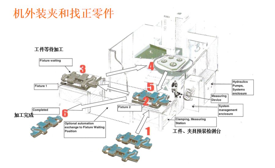 通过预调站+零点定位+快换夹具实现机外装夹,将装夹与加工分离,大幅缩短换产时间并提升机床利用率。