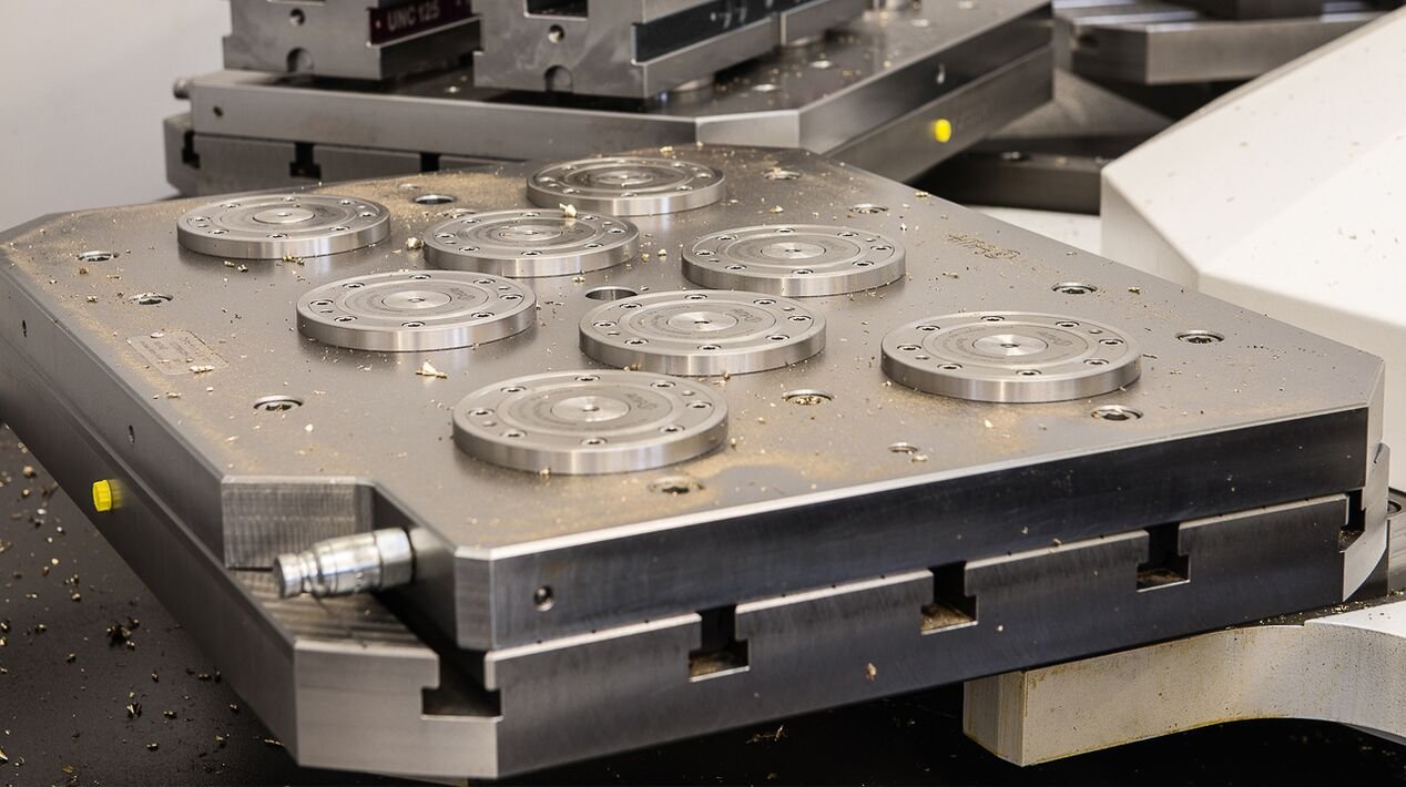 “零点定位系统+预调站+机外装夹”实现装夹与加工分离、时间并行与高精度快换,大幅缩短换产时间并显著提升设备利用率与OEE。