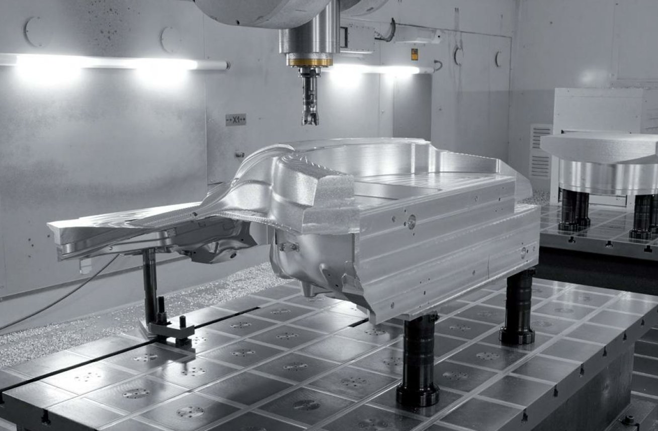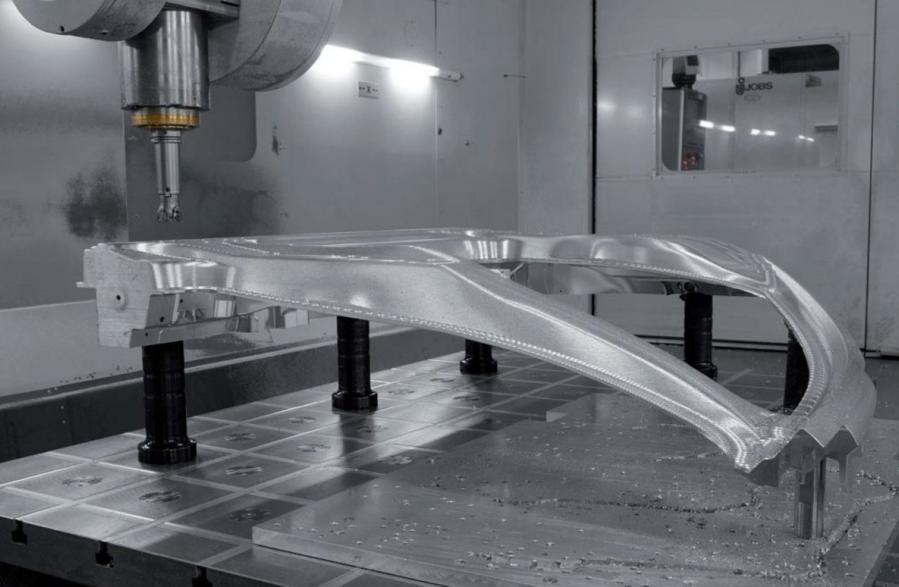 车身底板、侧围、车顶、行李厢盖以及轮毂等部件所用的大型铝合金毛坯,需要在大型龙门式数控铣床上精准定位并牢固夹持。Jobs LinX 系列机床中,配备有两张 1300×2000 mm 工作台、两张 1300×1000 mm 工作台以及额外的一张加工平台。