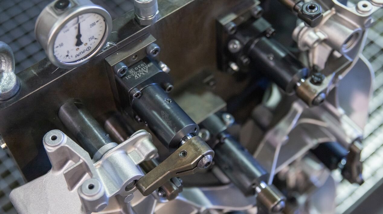 如今,夹具数量已超过200套,且均配备用于零点定位系统接口安装的拉钉。该公司自主设计的夹具系统中,每台机床均设有一块基准托板,通过拉钉与零点定位系统连接固定。AMF英世齐在此过程中提供了大量的产品与专业支持,例如:摆动夹、夹紧臂、截止阀、压力蓄能器、快速接头、压力表、立式压紧装置、支撑元件、管路,以及用于介质通道的接头等。凭借AMF英世齐完备的产品系列,客户大幅简化了采购与物流流程。