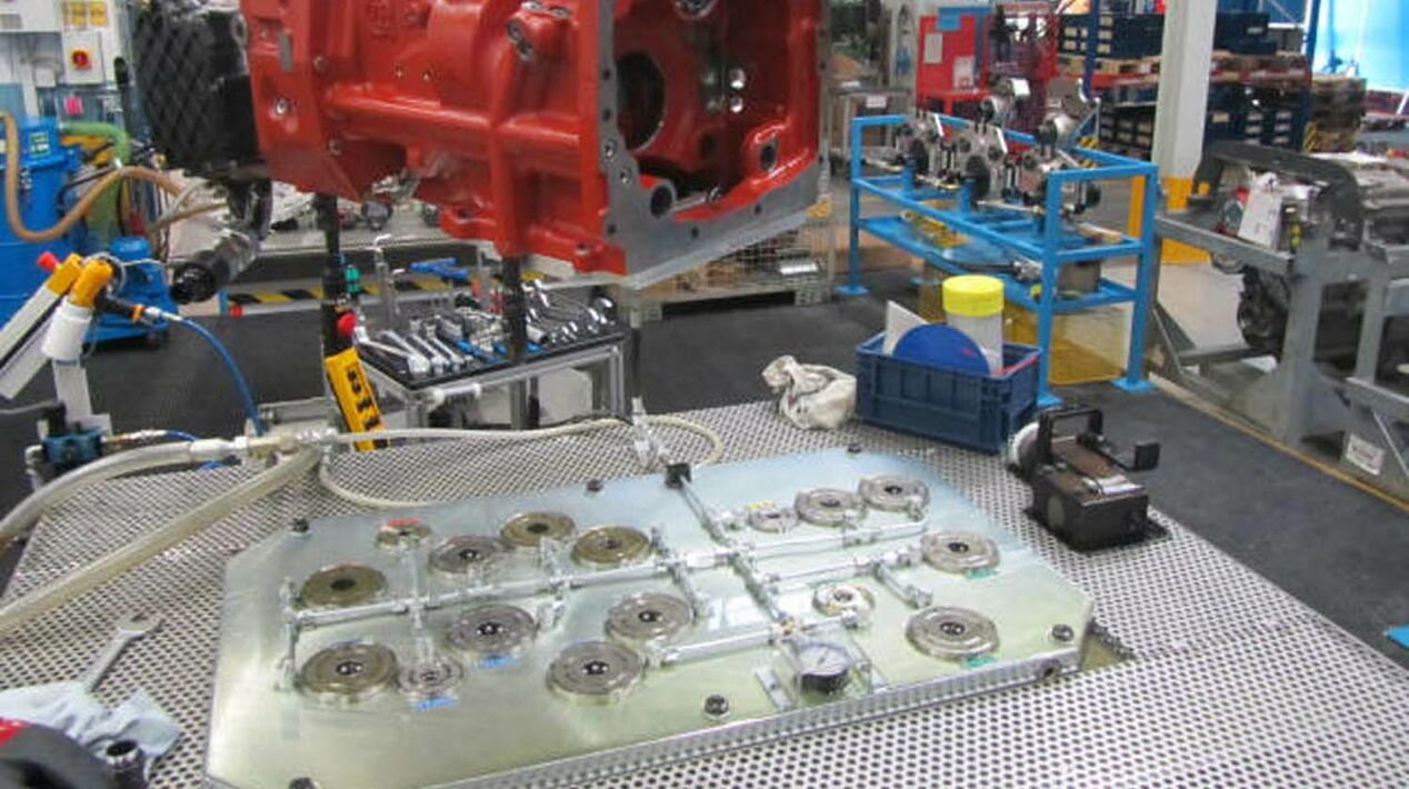 AMF英世齐的系统设计十分人性化。每个夹持模块都带有清晰的颜色标识,工作人员只需按照颜色放置变速箱,系统就能自动对准并夹紧,几乎不会出错。