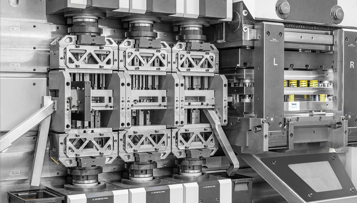 这套系统中,每个模具接口配置4个AMF英世齐KP5.3零点定位模块,采用气动控制,工作压力5~12bar。模具装入时,拉钉会以1.5kN的拉入力被吸入,同时以13kN的夹紧力完成锁紧定位,并同步进行位置检测。