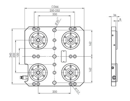 液压零点定位系统适用于T型槽间隙为63、100和125mm的机床工作台,通过M12的沉头螺栓紧固。至少有两个定位孔,以便准确定位。两个零点定位器之间的间距是200mm。液压快速接头是预先安装好的,气压除尘功能接口可选择性的接通。